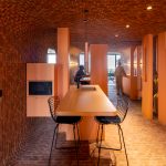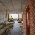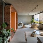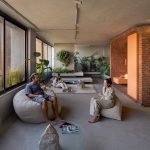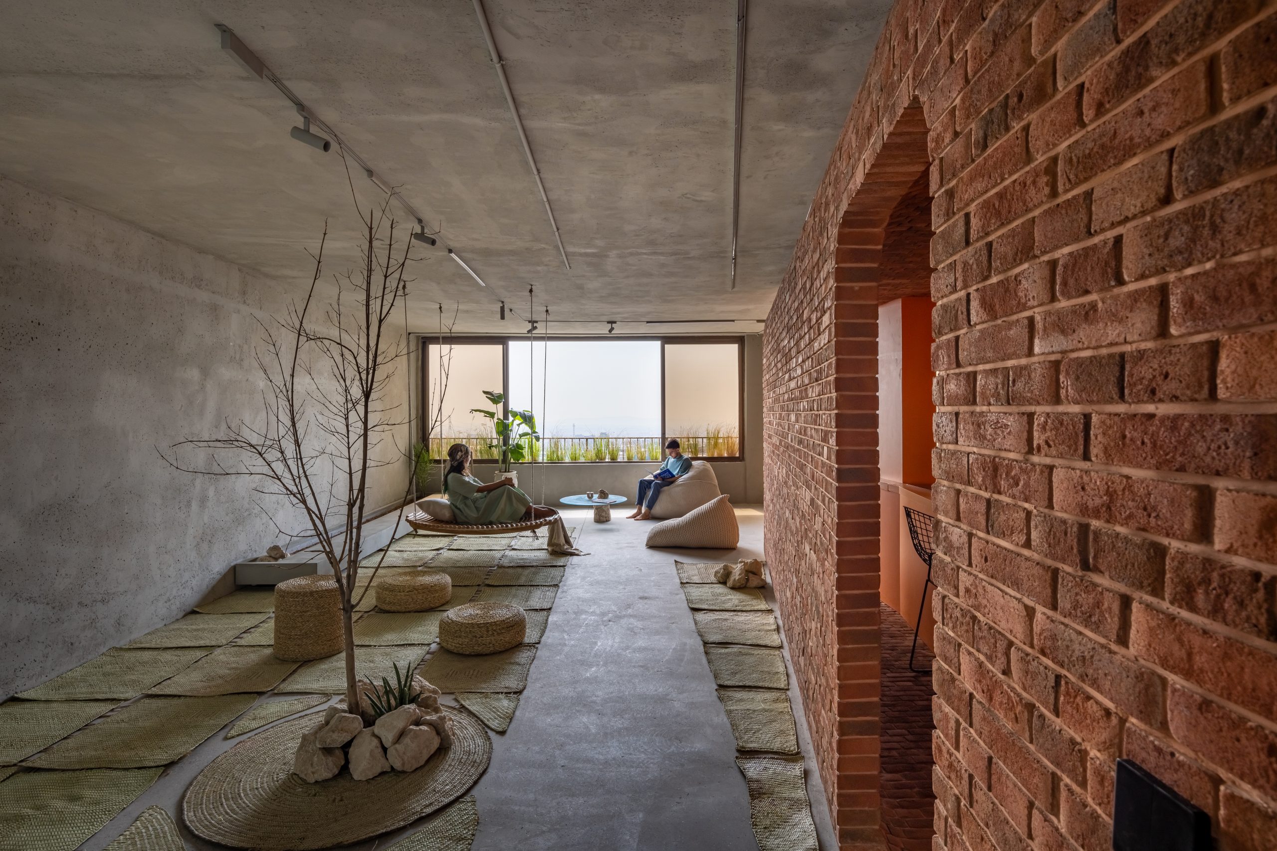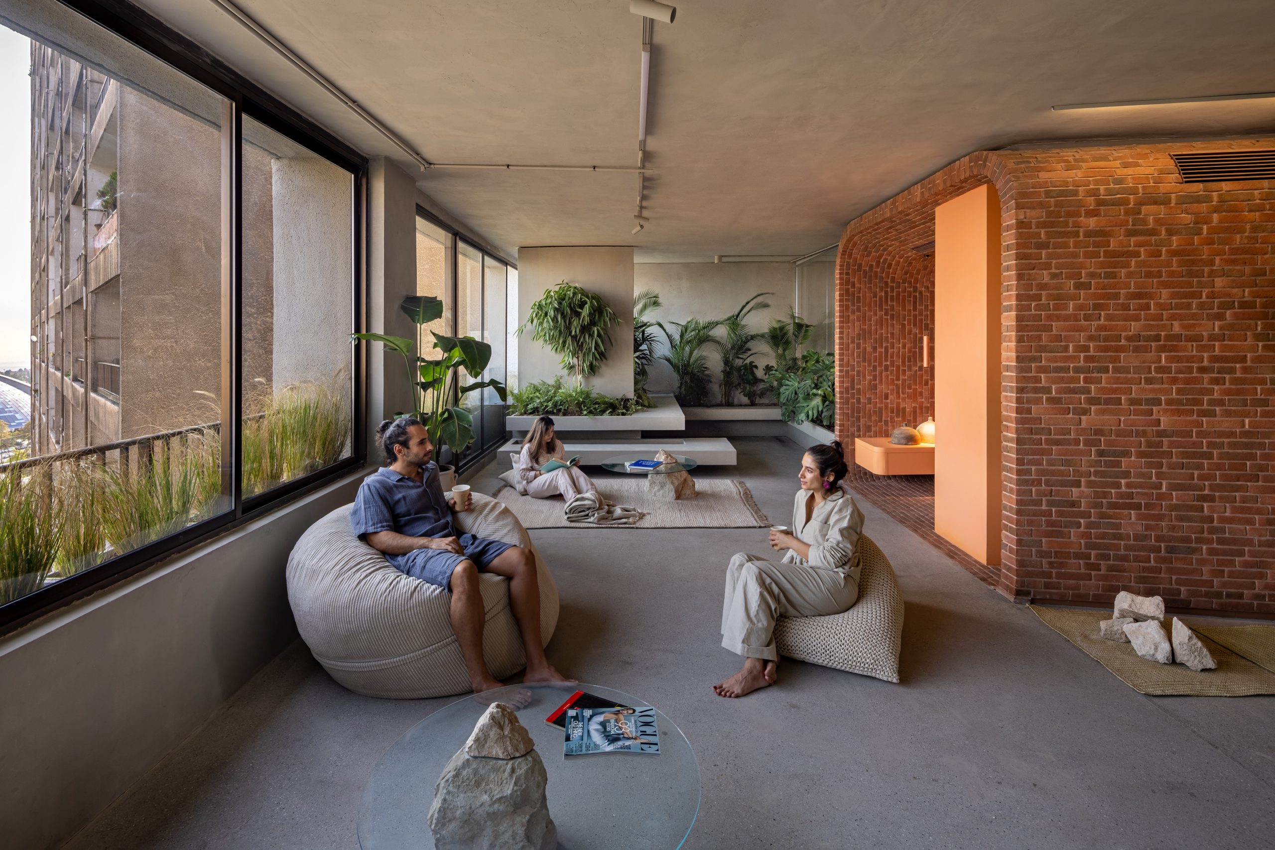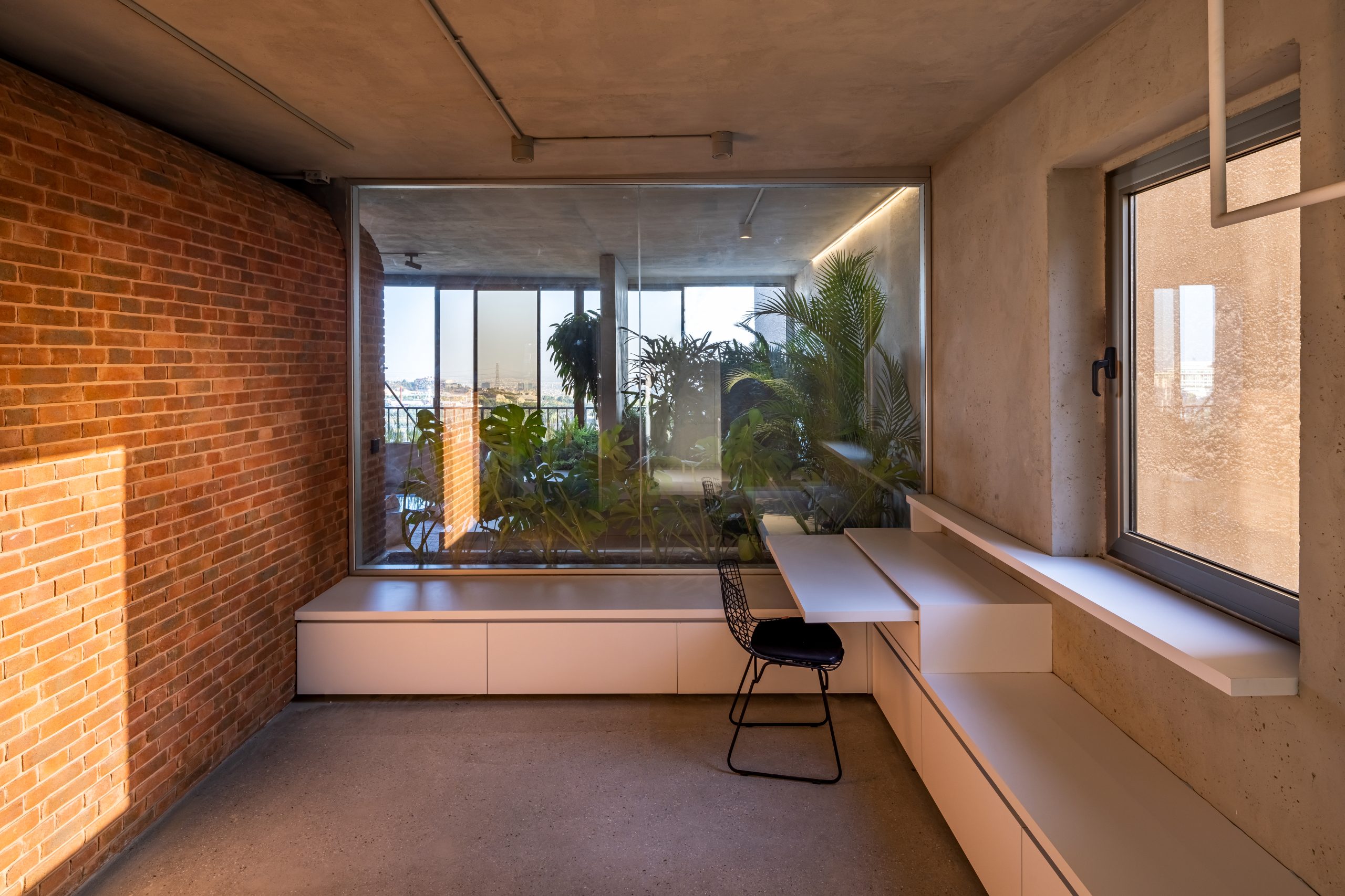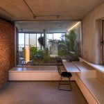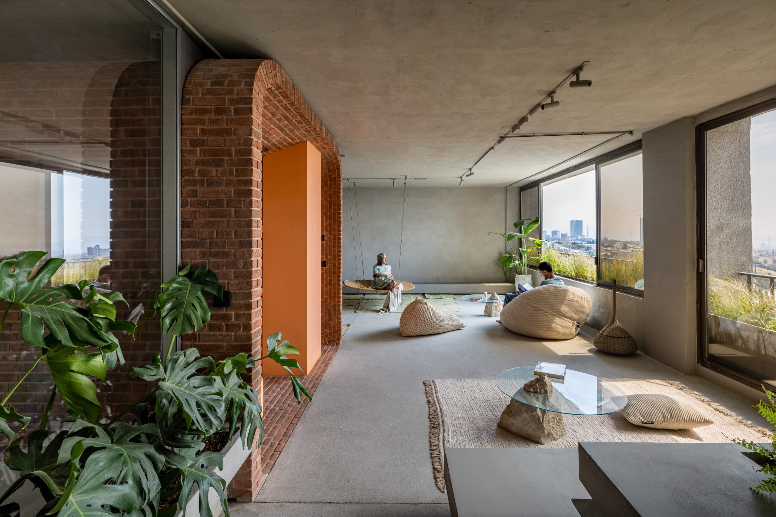 دیوار اتاقهای پاکت میانی از شیشه ساخته شدهاند و از پایین به بالا از حالت کدر به شفاف تبدیل میشوند. این خانه با داشتن آبنما، باغچه، تاب، کف و دیوارهای بتنی، تجربهای منحصر به فرد از یک خانهی حیاط دار در برج را به ساکنان هدیه میدهد.